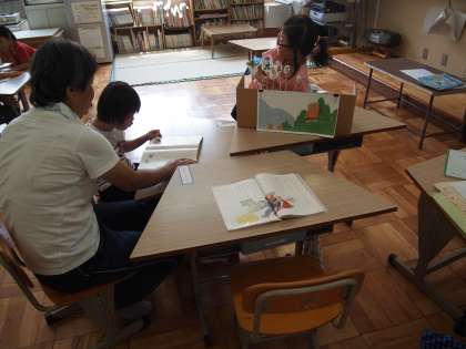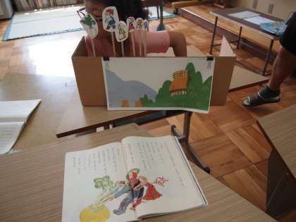 あおぞら学級の1年生は「おおきなかぶ」の勉強中。教科書の挿絵を参考にして段ボール劇場ののペープサート。割りばしの人形をさかんに動かして楽しそうでした。