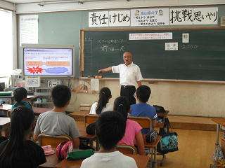 7月12日(金)京都府警OBの方に講師に来ていただいて,6年生を対象に非行防止教室が開講されました。子どもたちが将来いろいろな誘惑に負けないで,一人の社会人として自覚と責任をもってルールを守れるよう,ご自身の現役時代の体験談を交えながら熱く語ってくださいました。