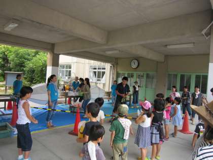 7月13日手作りされた行灯に,手形を・・・とPTAの皆さんが早朝より集まって準備をしてくださいました。