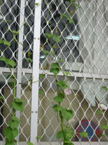 緑のカーテンにしようとしているあさがおなどが,ぐんぐん伸びています。