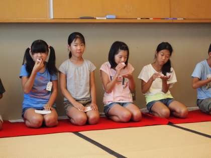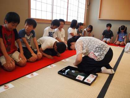 「みなさんもこれからお茶席に呼ばれることがあるかもしれません。そうした時にきちんとしたことができるといいですね…。」と話してくださいました。おじぎは丁寧さで三段階に分かれることや畳のへりを踏まないことなど,お茶席道徳の作法も教えていただきました。