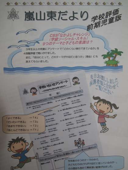 明日は学校評価・前期児童版を家庭数で配布いたします。今回は趣向を変えて「なかよしチャレンジ」(学級ソーシャル・スキル)の年間9つのテーマについて,「自分はそれぞれについてどれくらいできているか」「9つのテーマのうちで自分が一番大切だと考えているのはどれか,またなぜそう思うのか」を3年生以上の児童に尋ねています。