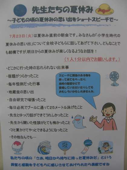23日(火)は夏休み前の最後の朝会です。今回の内容はぐっとくだけて『先生たちの夏休み』。嵐山東の教員が小学校時代の夏休みのエピソードを子どもたちの前で語ります。「ラジオ体操が楽しかったこと」「プールで必死に練習してやっと泳げた25メートル」「お化け屋敷で怖い体験をしたこと」…。