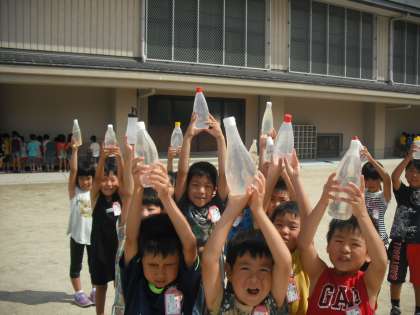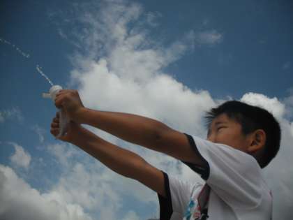今回は,水を使ってさまざまなあそびをしました。マヨネーズやケチャップの容器を使って,水をとばします。水をとばす力で旗を倒したり,地面に絵を描いたり…。