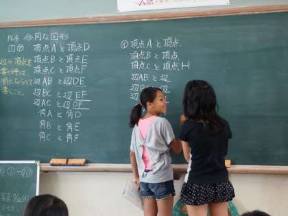 「合同」と聞くだけで「ちょっと苦手やったなぁ…」とおっしゃる保護者の方もおられるかもしれませんね。夏休みを目前にした子どもたちですが,一生懸命考えていました。