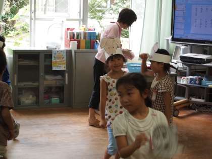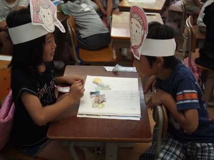 1年1組では「おおきなかぶ」の発表会が始まろうとしていました。いままで友だちと練習してきたようです。かぶりものをかぶってワクワクしていました。