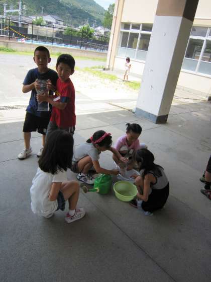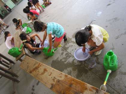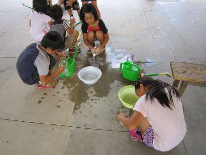 でも,かさは実際に体感しないとよくわかりません。今日は,大渡り廊下でリットルますを使って,dL,mL,Lを量りとり,体感していました。