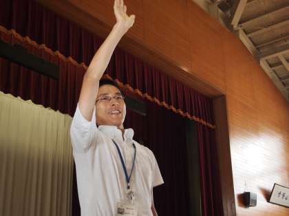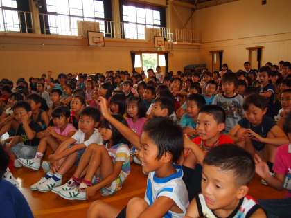 ふだんの朝会と違って「何が出てくるんだろう?」という感じで興味津津の子どもたち。予想外の先生が予想外のことをすることで二度びっくり。ジャイアンツの阿部慎之介の応援ソングで踊りだす先生もいました。