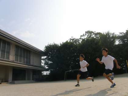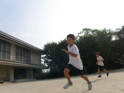 セミ時雨の中,陸上部活の朝練が始まりました。最初はみんなちょっと体は重そうでしたが,ダッシュ10本が終わるころには元気に走っていました。
