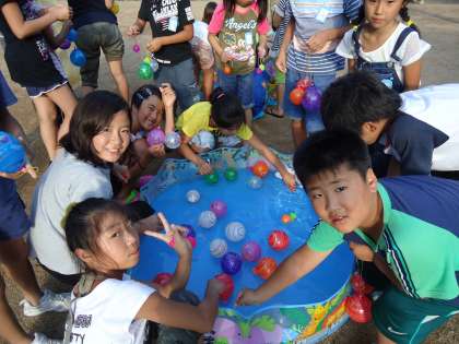 カレーが出来上がるまではPTAさんの手作りお店の時間です。ヨーヨー釣りに射的が校庭に登場。縁日のような雰囲気で盛り上げていただきました。