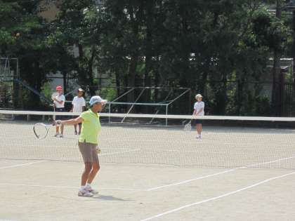はじめは,コーチや教師と打ち合ったりしながら,打ち方の練習をします。その後は,ゲーム形式の練習をしていきます。暑いですが,休息をとりながら,懸命にボールを追いかけている子どもたちです。