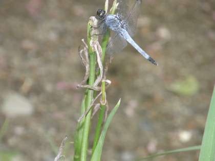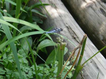 ビオトープにシオカラトンボがいました。尻尾の先が黒い灰色がかった水色の体は昆虫図鑑に載っている写真と全く同じです。カメラを持って近づくと気配を察して飛んで行きますが,またすぐに戻って来ます。そんなことを5分ほど繰り返していました。よほどここが気に入ったのでしょうね。