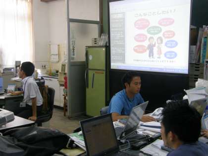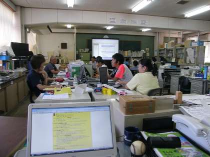 「ICT機器を上手に活用して学習効果をアップさせたり,配布プリントや掲示物に新鮮味を出せたりすることができたら…」との願いで校内研修会を持ちました。それぞれのICTスキルの交流もなかなか新鮮でした。夏休み明けから頑張って腕を磨いていきたいです。