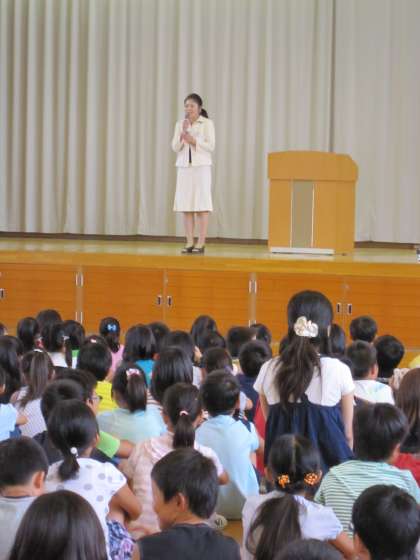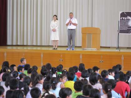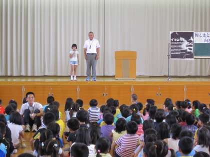 全校の前で二人を学校長が紹介しました。