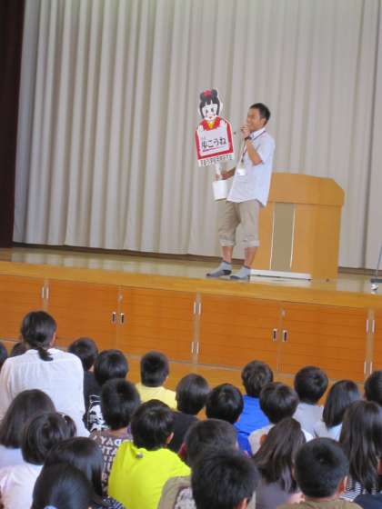 新しい転校生として昨日ホームページで紹介した2人を,朝会でも紹介しました。胸には「歩こうね」と書いています。この2人を見て,走る子が一人でも少なくなってほしいと思います。
