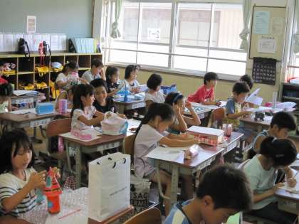 子どもたちは朝から,夏休みに作った作品を持って登校してきました。