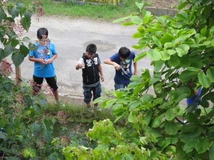 今日1組の子ども達は,ビオトープでの水の中にどんな生物がいるのかを観察しました。