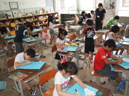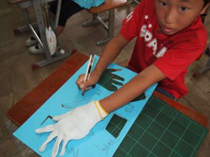 2年生は「ひかりのプレゼント」というステンドグラスのような作品を作っていました。カッターナイフを使って段ボールを星や幾何学模様に切っていきます。慎重さと大胆さの両方がいる作業ですが,どの顔も集中していて真剣そのものです。