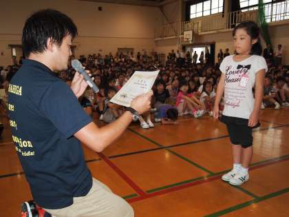 『目を見てはっきりあいさつ名人』…「あらひがスローガン大賞」の表彰式が「きらめきタイム」の終了後に行われました。1年生にもかかわらず堂々とした姿勢で立派に賞状を受け取ることができましたね。