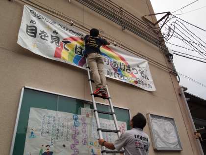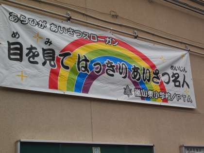 「目を見てはっきりあいさつ名人」の横断幕が中校舎の壁にお目見えしました。PTA本部役員さんに取り付けていただきました。とても目立ついいところに貼ってもらいました。みんなが意識して素敵なあいさつが広がる学校にしていきましょう!