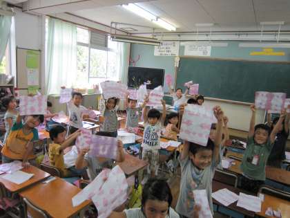 1年生は,アサガオの花などを使って和紙を染めていました。