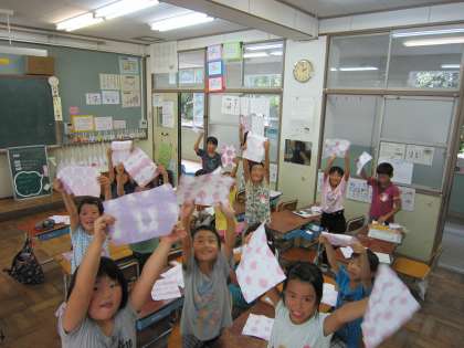 「先生,こんなにきれいに染まったよ。」と一人の子が言うと,周りの子たちも・・・。全員が手に染めた和紙を持って,見せてくれました。
