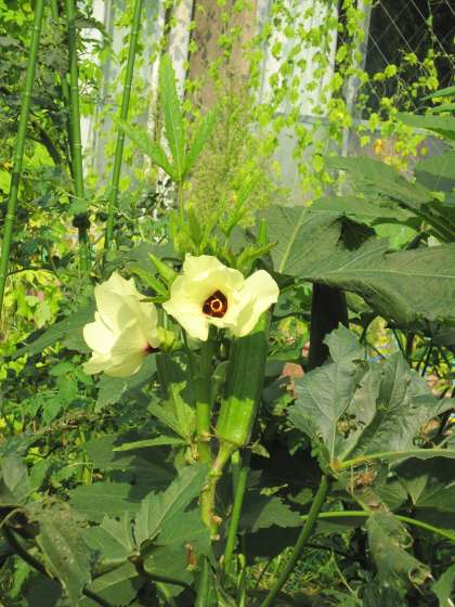 花壇のオクラにきれいな花が咲いていました。