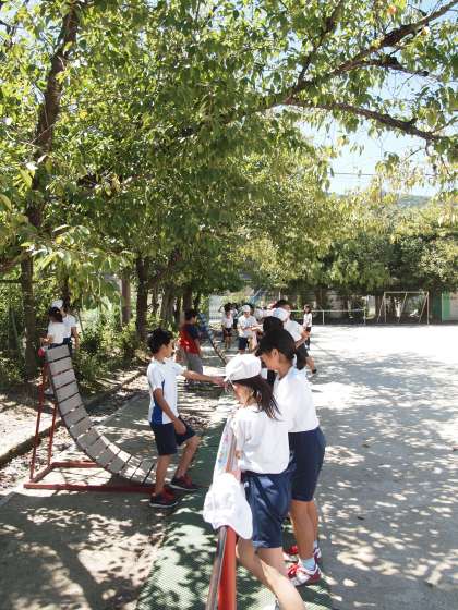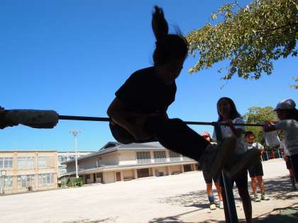 これ以上ない「嵐山東ブルー」の晴れ渡った空…。桜の木の下で子どもたちがクルクル回っています。逆光がシルエットになって青空に映えています。5年生の子どもたちは励まし合いながら逆上がりやダルマまわりなどの技にチャレンジしていました。やさしく穏やかな時間が流れています。