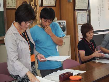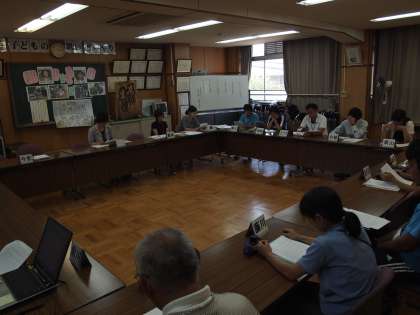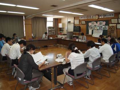 授業のあとは研究会です。授業の中で写真や絵,ビデオなどの資料を使いましたが,「それは授業のねらいを達成するために効果的だったのか?」などを教員全員で授業を振り返り意見を出し合いました。また,教育委員会から指導助言の先生に来てもらい多くのアドバイスもいただきました。