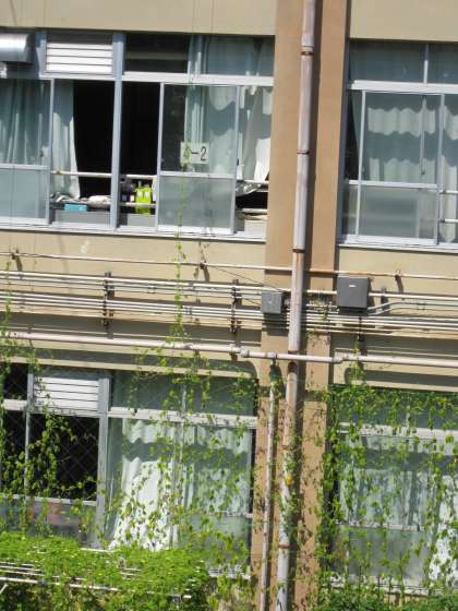 緑のカーテンのゴーヤが,どんどん育って,もう2階の窓の上のほうまで伸びています。いったいどこまで伸びるのかと,楽しみにしています。