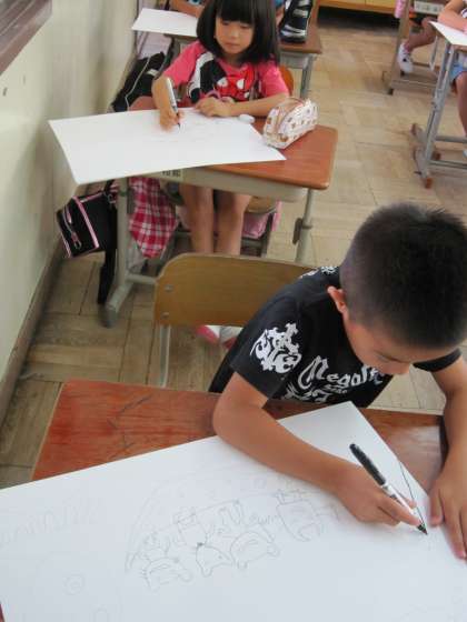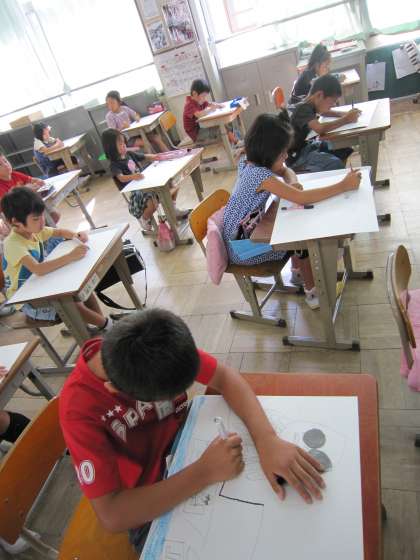 油性ペンでは,一度書くと消せないので注意して描くようにとの話を聞いた後,描きはじめました。みんな慎重に線を描いていました。