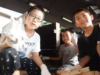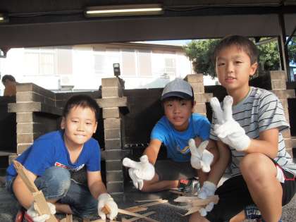 野外炊事は火起こしが結構大変。子供たちは新聞紙に火がつきさえすれば,それでO.k.のように思っています。まきに火がしっかり燃え移るまでには熟練(?)を要します。おかずの準備ができていないのにかまどの火がボーボー,ということもよくあることです。