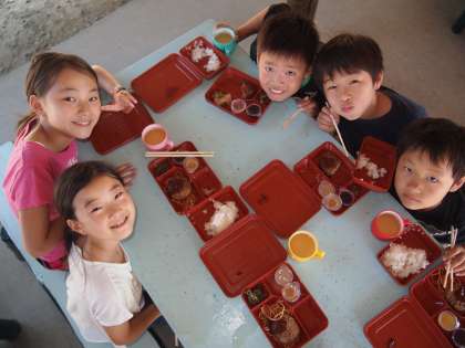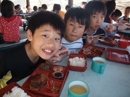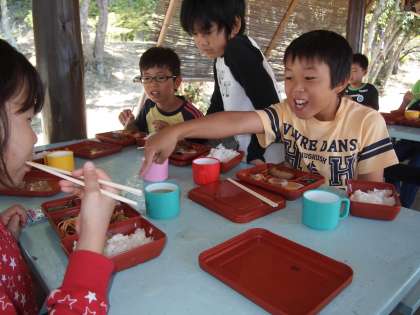 少々疲れていてもお昼ごはんの時は復活します。「今やったらきも試ししても怖ないねんけどなぁ」とか「おかずのハンバーグがどうとかこうとか…」盛り上がっていました。