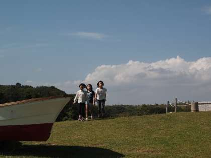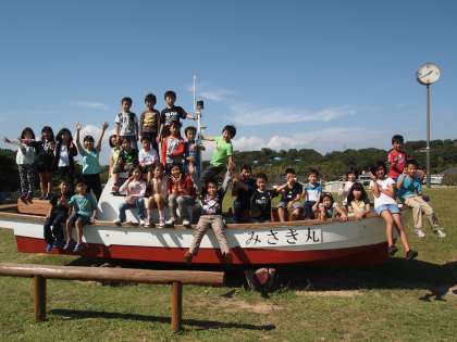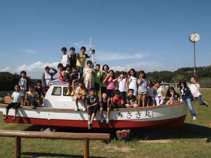 お昼ごはんの後のリラックスタイム。クラス写真を撮りました。ものすごく澄んだ空気と快晴の空,とっても気持ちの良い大自然です。