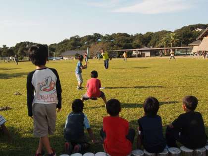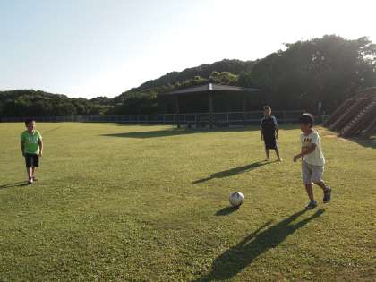 芝生広場でスポーツタイムです。ソフトボールやサッカーで思い切り汗を流しました。