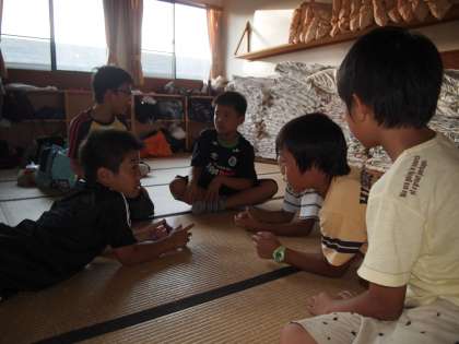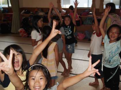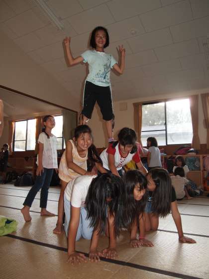 活動の合間にちょっとした時間ができることがあります。そんなときの子供たちの表情はとても魅力的です。女子は90畳の広間で組体操をしていました。来年の運動会に備えているのでしょう。