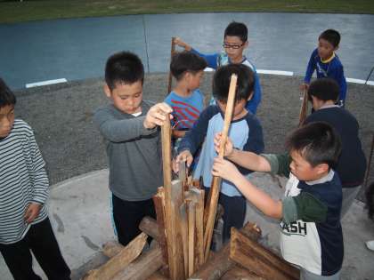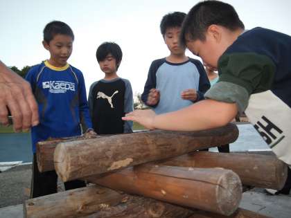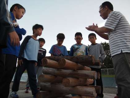 キャンファイアーで使う木を井桁に組んでいくのもファイアー・レクレーション係の仕事です。説明を聞いて見よう見まねでやっていくと…見事な井桁が出来上がりました。さぁ,これで準備万端です。点火は午後7時!