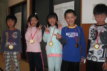 ファイアーの後は90畳に戻って浦山ラリーの表彰式です。見事1位になったグループ全員に担任手作りの金メダルが授与されました。また,チームの団結が強かったグループには審査員特別賞が贈られました。写真は感激のあまり金メダルをかじる「選手」です。