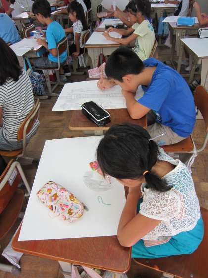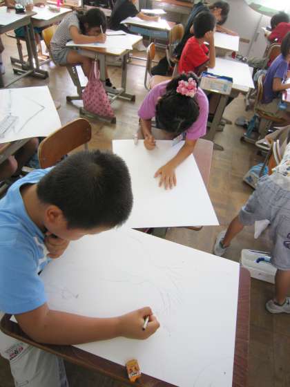 今日は,下絵を描いていました。それぞれがお話を聞いて想像した風景を画用紙に描いていました。