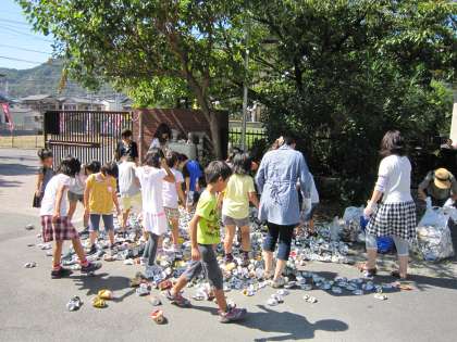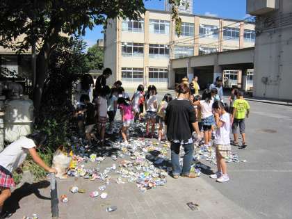 PTAや地域の方々のご協力で,集められたアルミ缶をPTAの方と子ども達とで小さくして回収してもらいます。