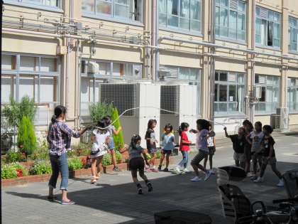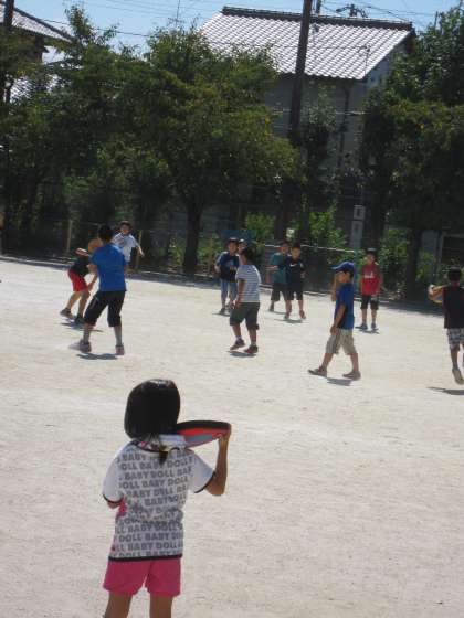 運動場でボールやフリスビーで遊ぶ子,長縄跳びをする子,鉄棒で遊ぶ子とそれぞれの楽しみを見つけて遊んでいました。