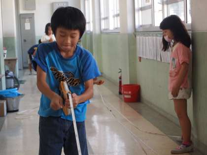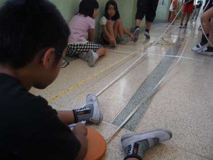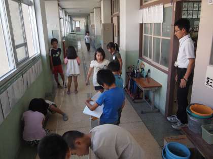 早速,ろう下に出て中校舎2階の端から端までの長さを計りました。子どもたちに尋ねてみると「44mでした」「ぼくとこ45m!」不思議ですね。そこで担任の先生が「ろう下の長さが伸び縮みしたのかもしれないね」の一言…。