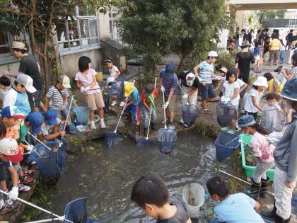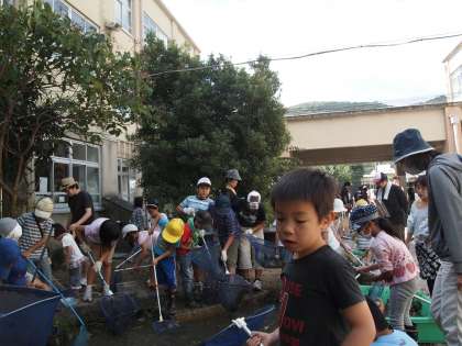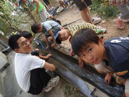 いよいよお待ちかねのムシムシ大観察会。まずはビオトープをみんなで網でさらいました。