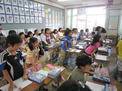 時間のはじめには,教室で教科書をみんな立って読みました。