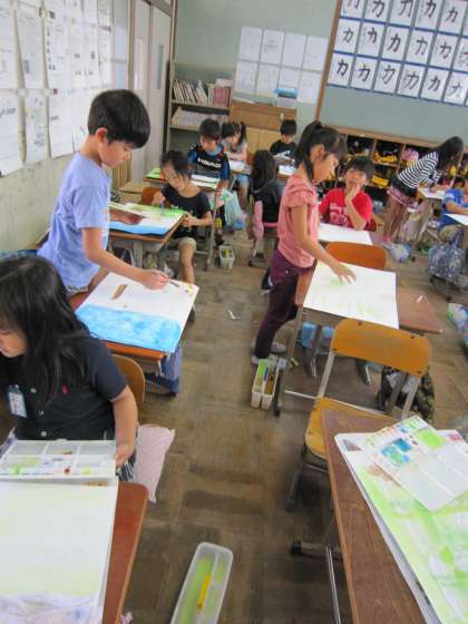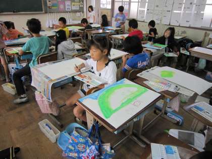 3年2組をのぞくと,子ども達が色を塗っていました。