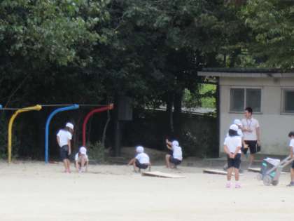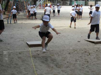 踏み切った後,高く跳ぶ感覚を身につけるために,ふみきり板を置いて練習していました。高く跳ぼうとふみきると遠くまで跳べるのですが,高くというのがなかなか難しくて,子ども達は苦労しています。