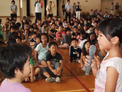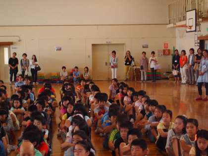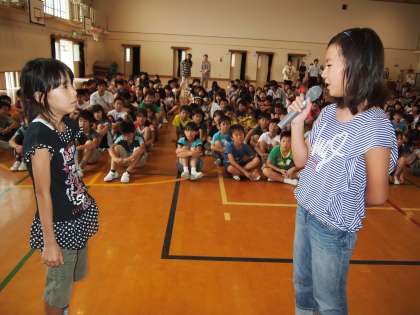 加えて,質問や感想を話しに来てくれるお友達に対する切りかえしの感想や質問の練習をしています。これがなかなか難しいのです。大人のように聴き取りやすい言葉で話してくれるとは限りませんし,話が広がっていかないような感想で困惑することもしばしばです。けれども,それでも「何とかしよう」という子どもたちの表情はすばらしいものです。こちらが十分待ってあげればそれなりの言葉でつないでくれるケースがほとんどです。今日は2年生の受け答えの時に会場の一部の子どもたちがおしゃべりをする場面が見られましたが,このあたりを鍛えていく必要があります。