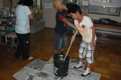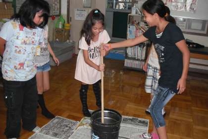 委員会活動の際に,保健安全委員会では「廃油石けん」を作りました。子どもたちは,いつも家庭で使っている石けんをイメージし,廃油を見せただけで「汚い!」「臭い!」と言っていましたが,材料を入れて混ぜる段階からみんな協力し合い,なめらかなクリーム状の液体になりました。これから1ヶ月程,乾かします。