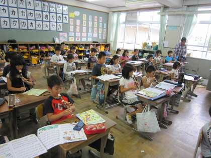 3年生からリコーダーの練習を始めた子ども達です。リコーダーの持ち方を指導しながら練習を重ねています。