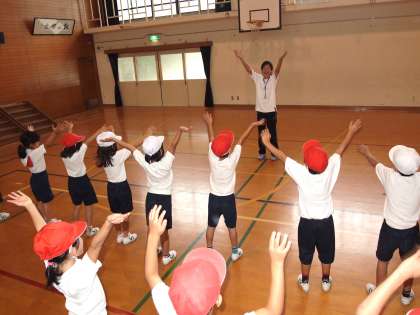 1年生はダンスをしました。「ジェンカ」はもう何度かやっているのでスムーズに二人組になって踊っています。どの笑顔も楽しそうです。「タタロチカ」は「えい,や〜!」掛け声を入れてみました。みんなパワーが全開です。今日は教育実習生が授業をしましたが子どもたちは注意深く話を聞き,出された指示に素早く反応していました。この半年でずいぶん成長したのですね。